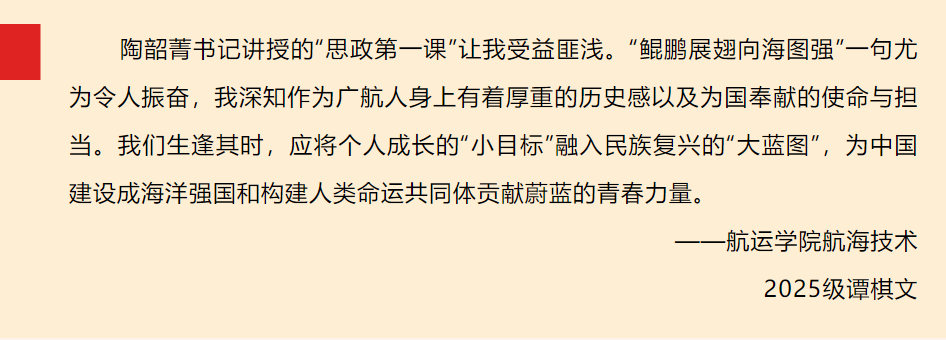 陶韶菁的授课紧紧围绕海洋强国与交通强国战略,从“领航定向”“时代机遇”“广航贡献”和“新生使命”四个方面深入浅出地阐述了新时代青年应如何与时代同进步、与祖国共成长,既有理论指引,又有数据支撑、案例佐证,更饱含着对青年学生的深情关怀。